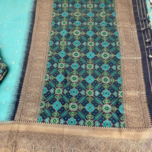 sea blue patola silk saree with Ikkat design pallu along with stitched blouse and pico(fall)