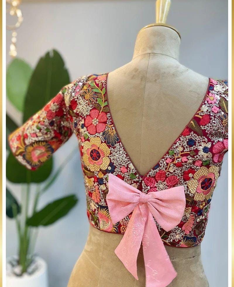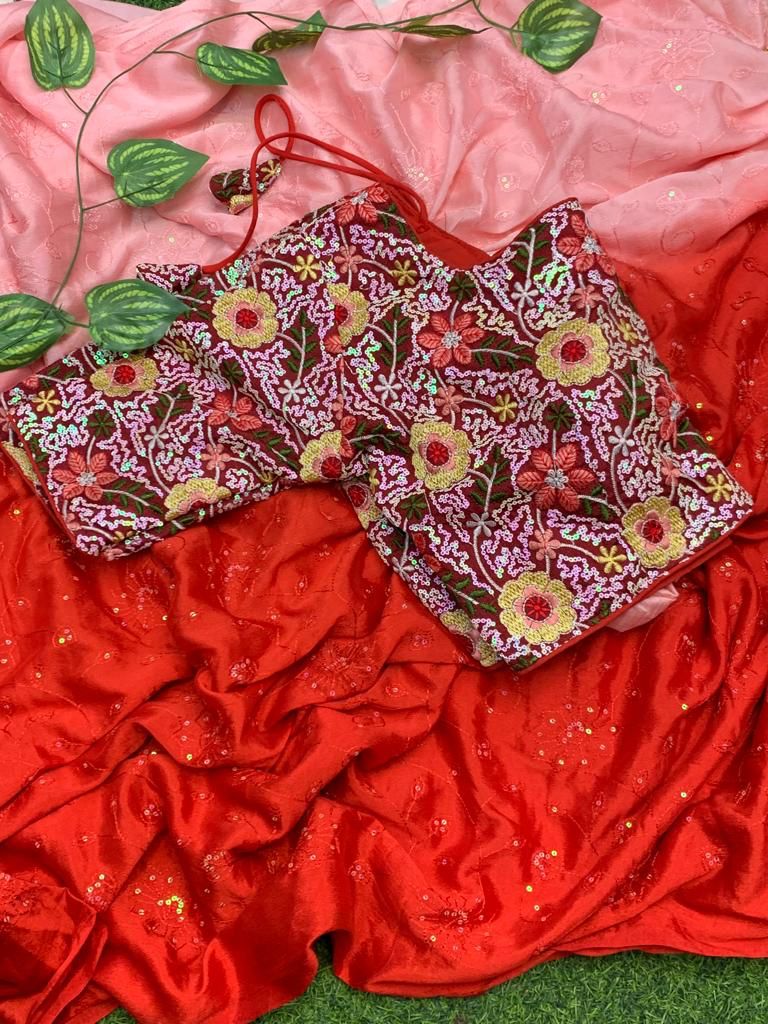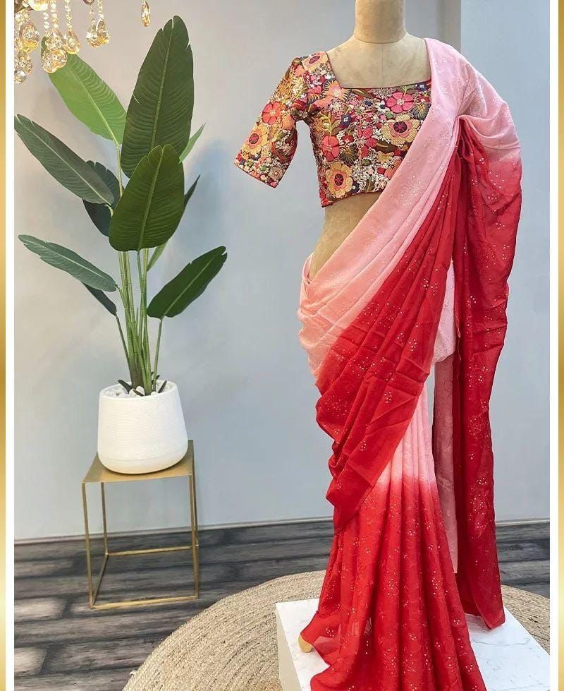 Red and Pink died Crepe Saree With Work on Blouse and Saree.