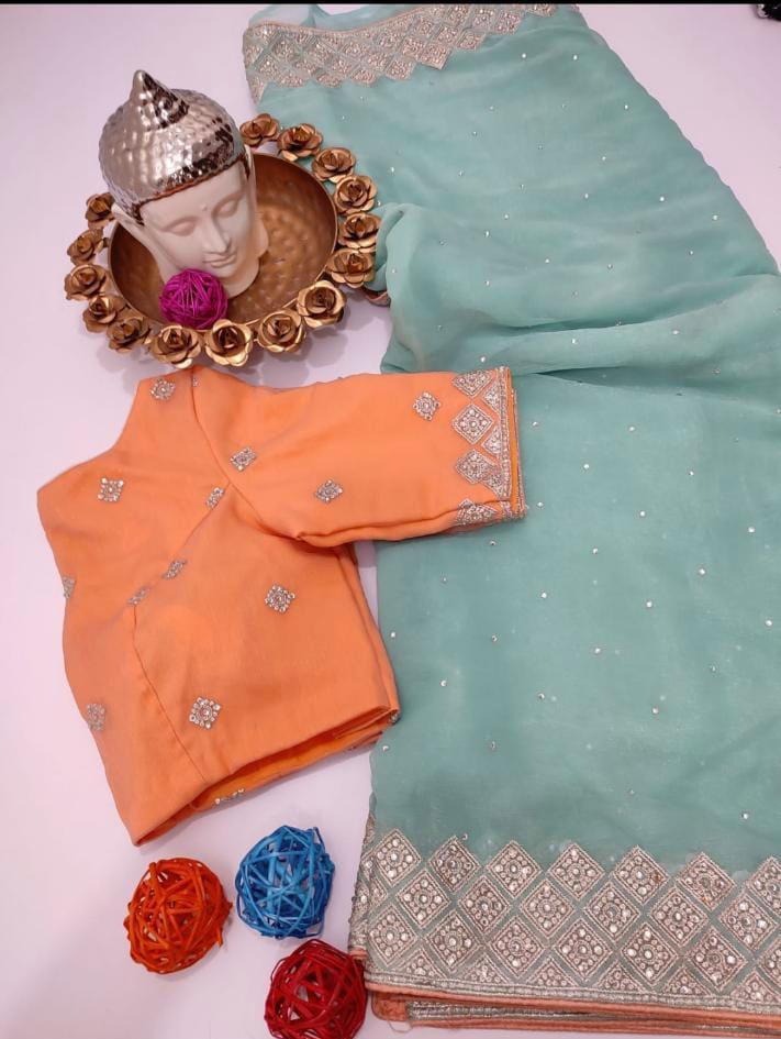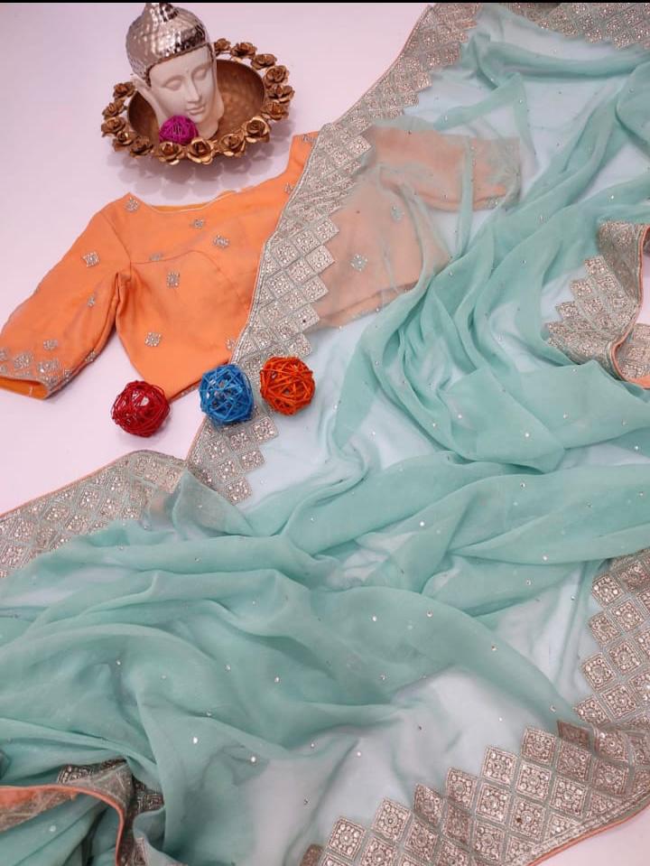 Exclusive designer pure shimmer chinnon sarees having rich border and all over stone work paired with pretty contrast blouse