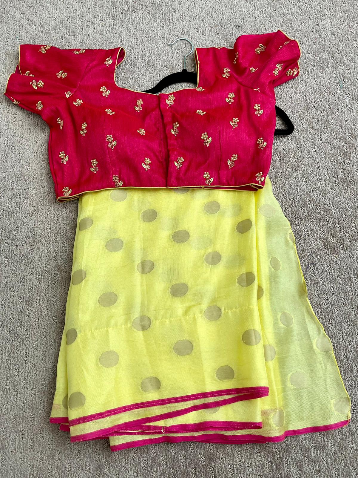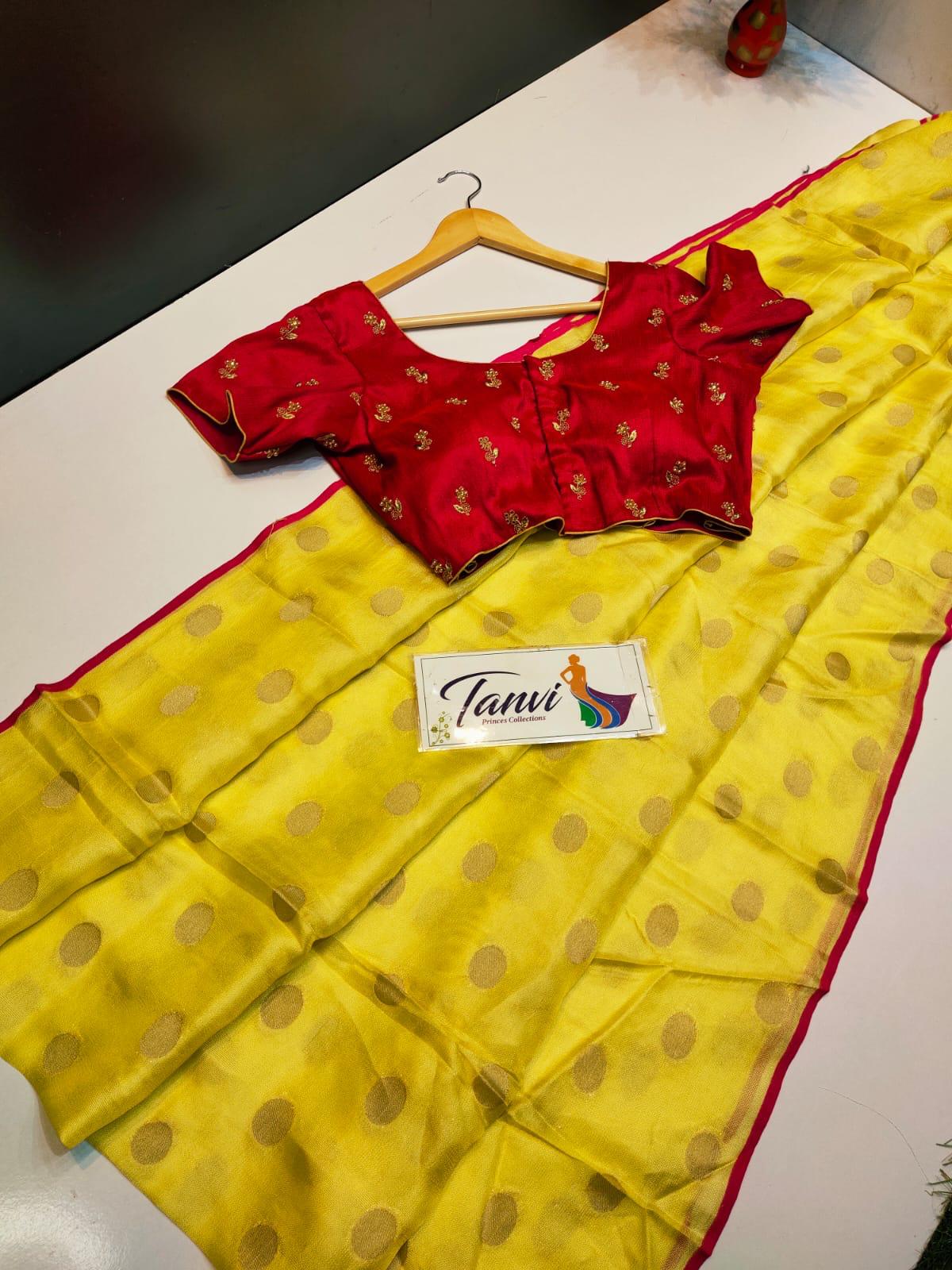 Yellow color saree with red stitched blouse and comes with pico(fall)