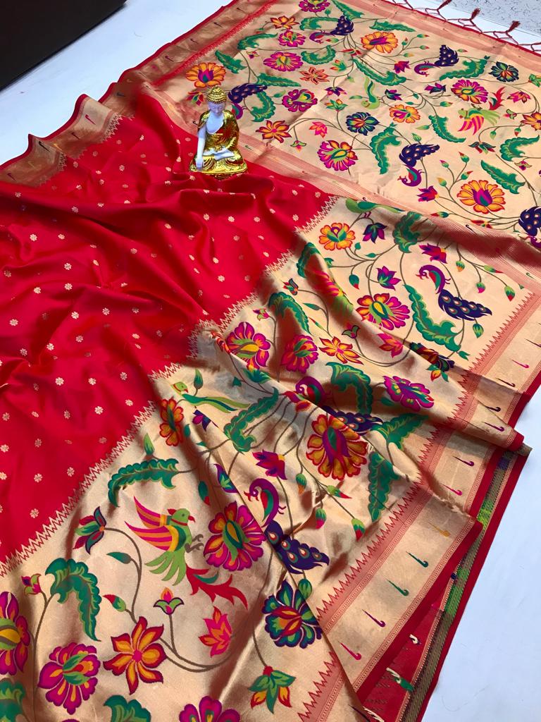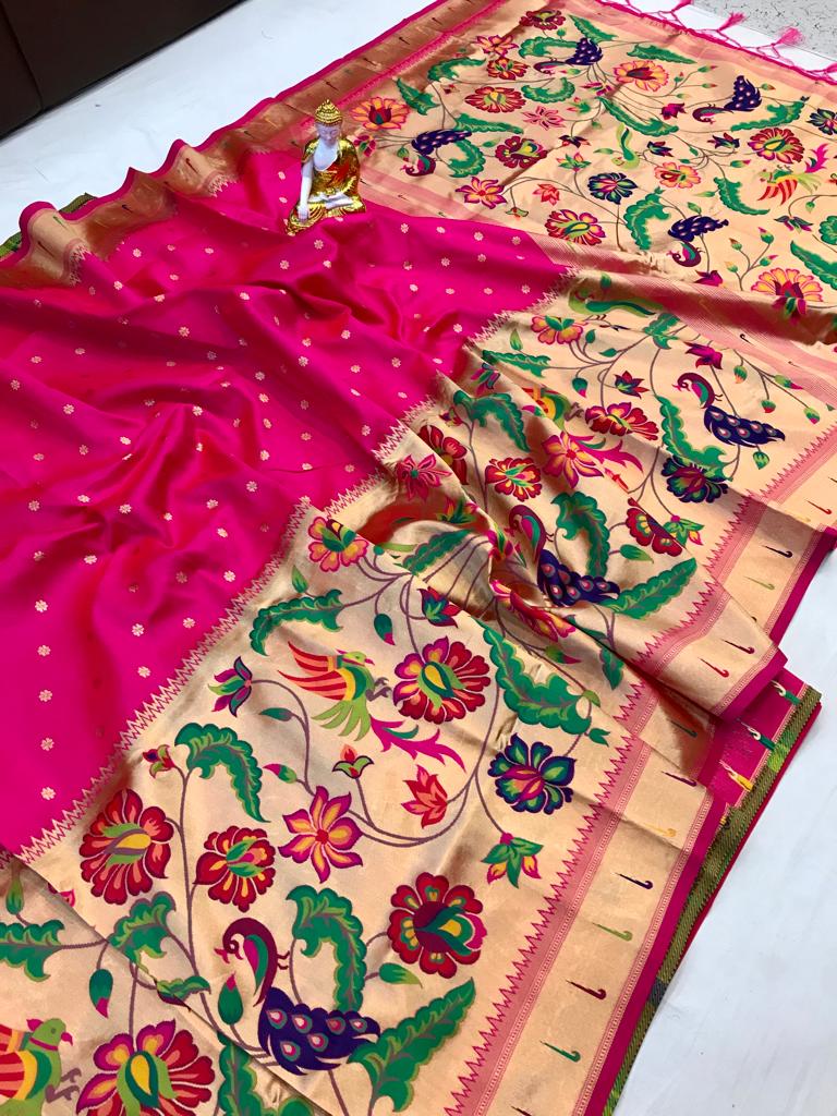 🧶Fabric :- Most Unique Selective paithani Banarasi saree design weaving with Gold zari and colorful Minakari on big border with nice dashing pallu & tussal.