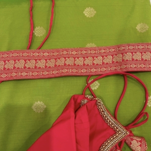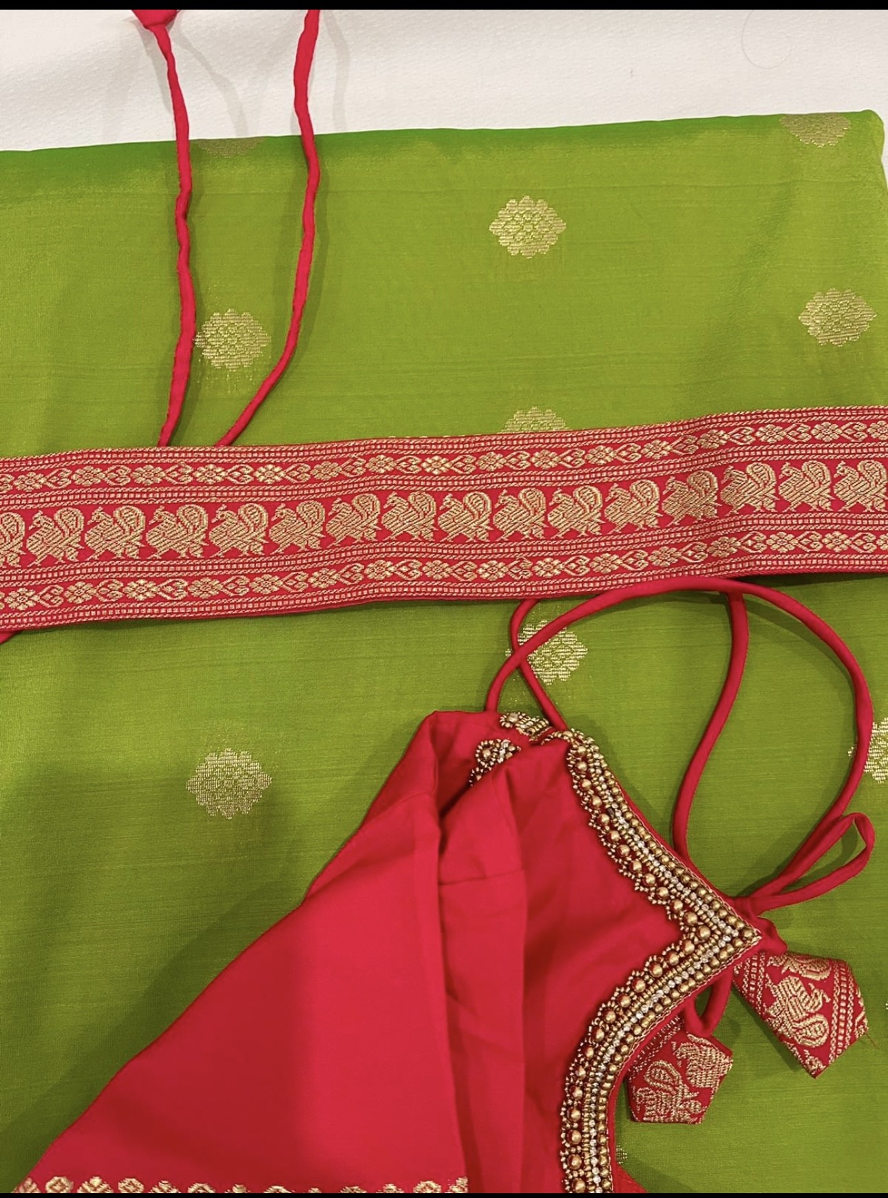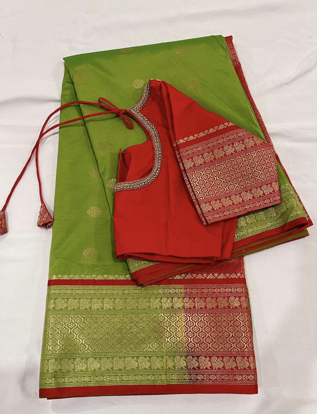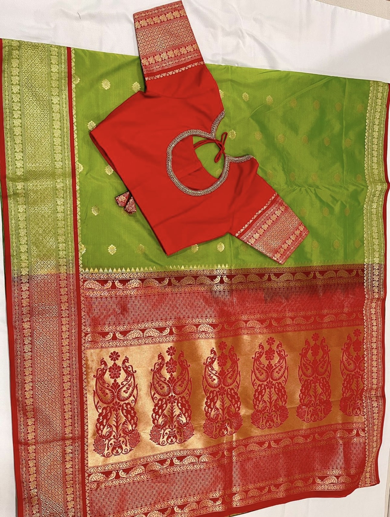 Paithani semi-silk saree with the gold color butis all over the saree.