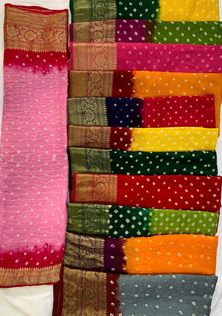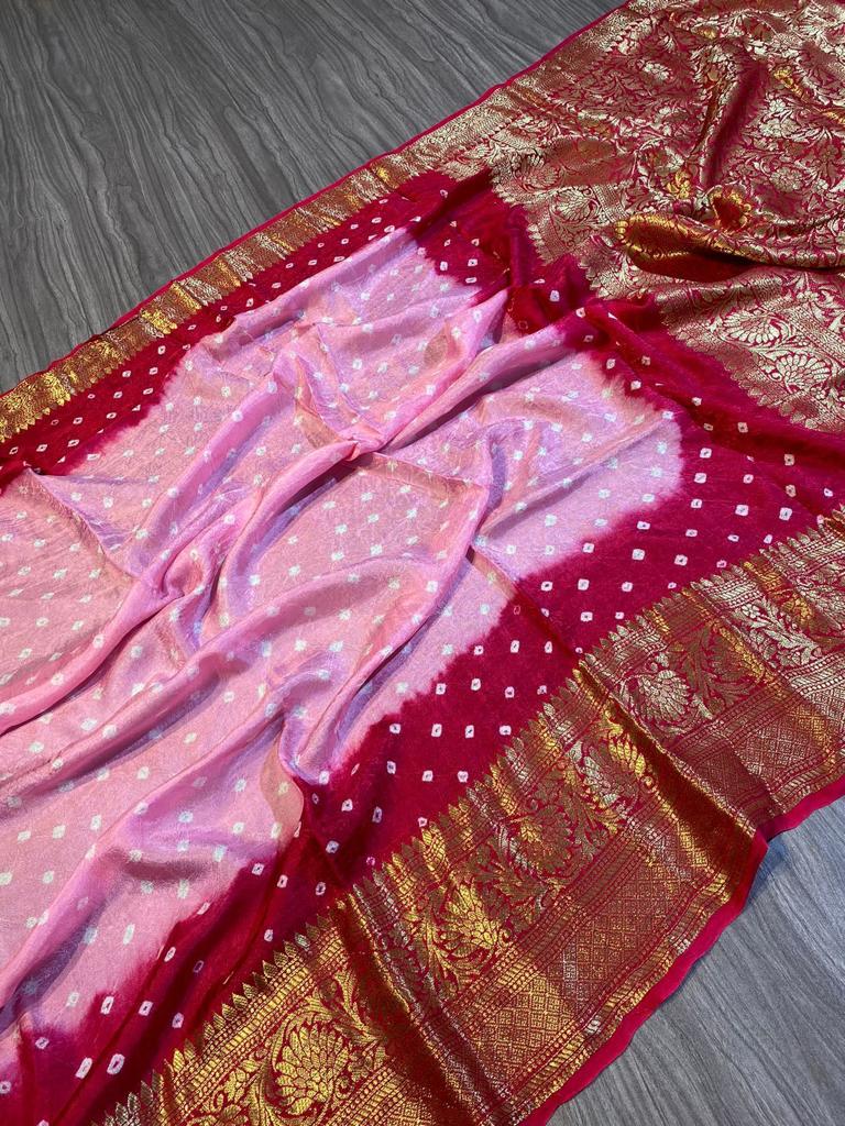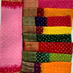 New premium and high quality , comfortable Bandhej silk drapes with Kanchipuram zari border that is super stylish and pretty