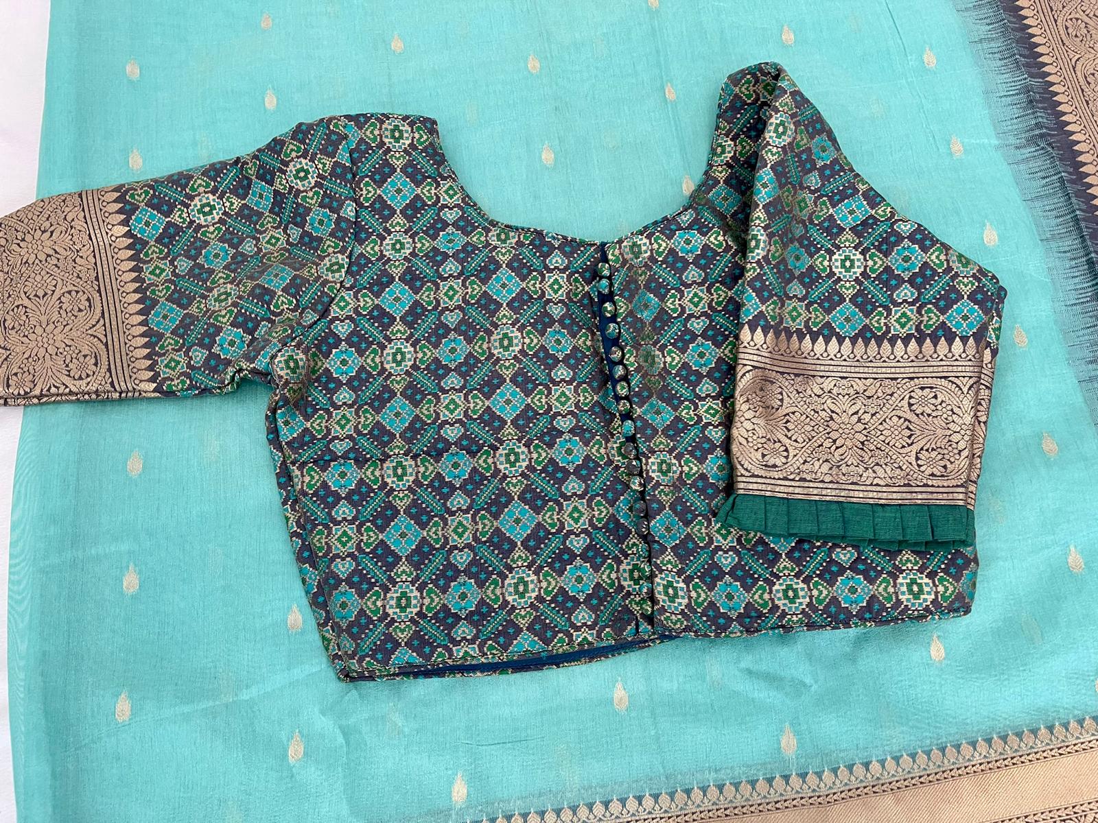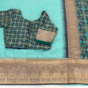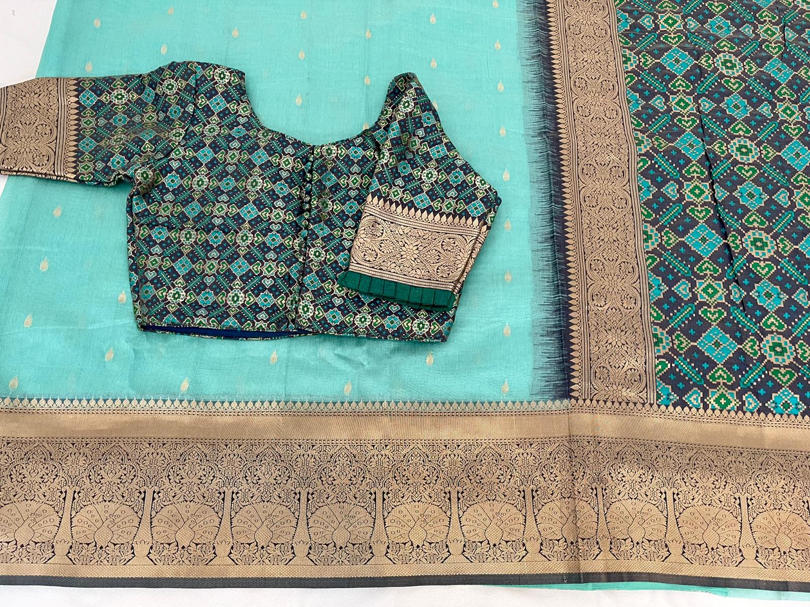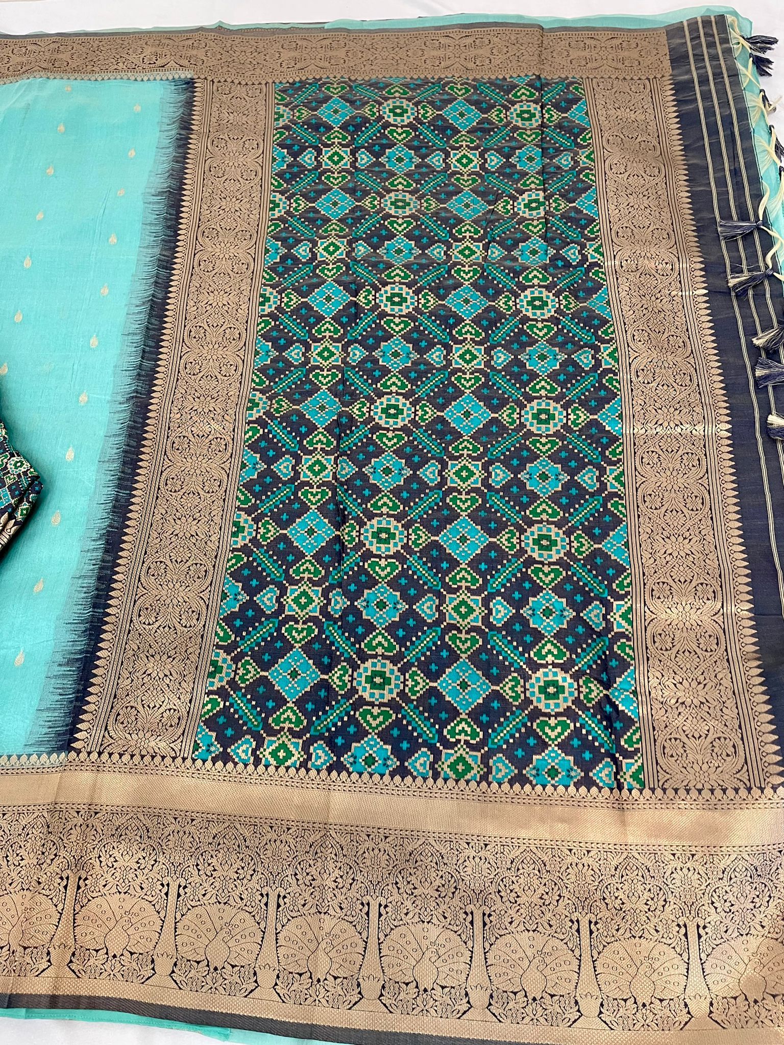 Beautiful sea blue patola silk saree with Ikkat design pallu along with stitched blouse and Pico(fall).