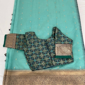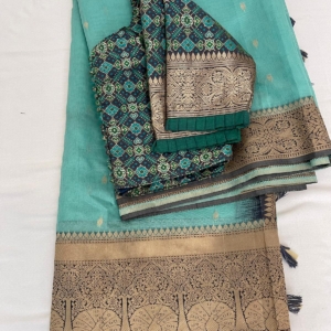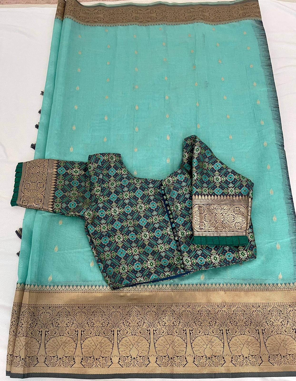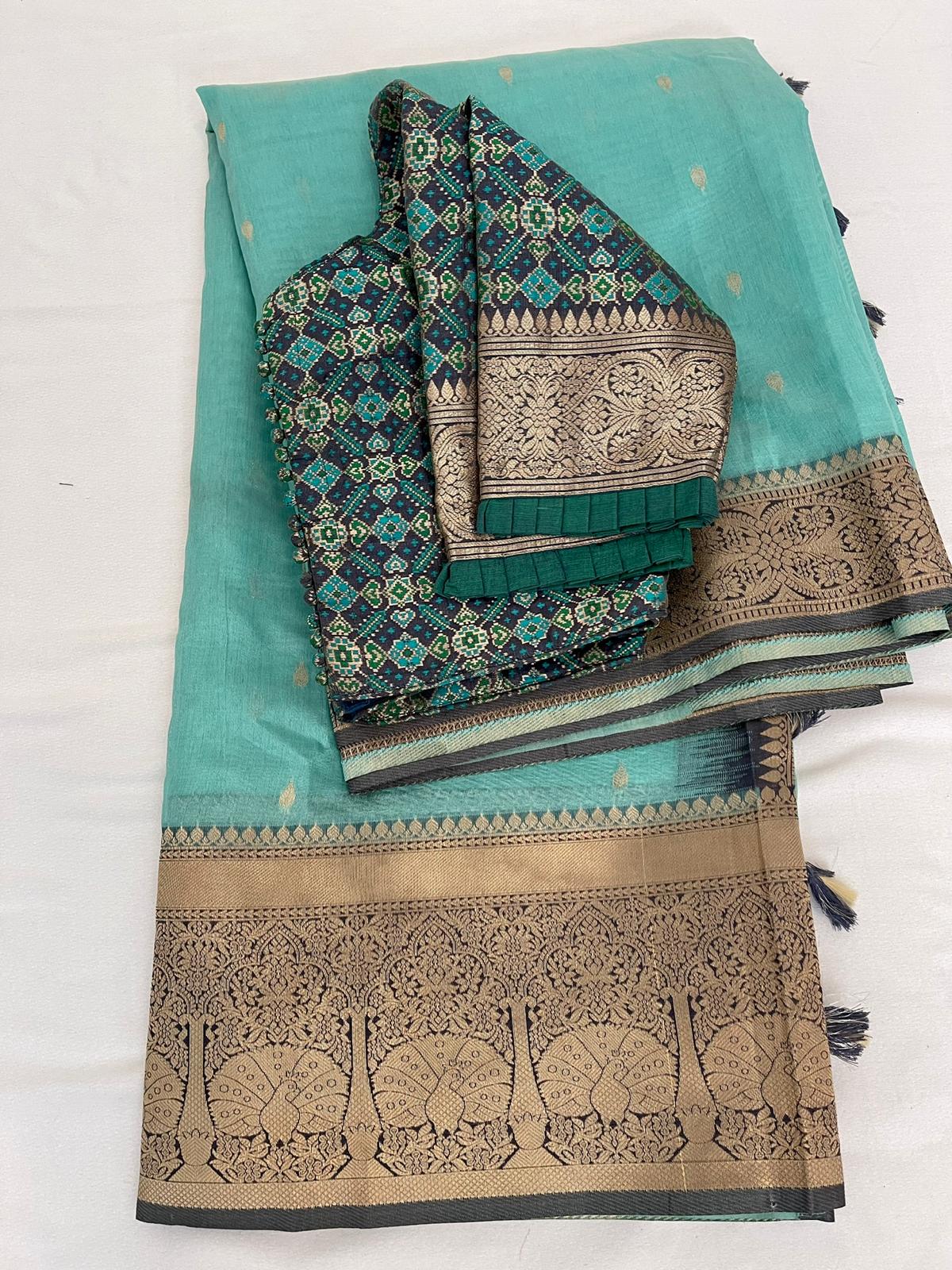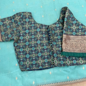Beautiful sea blue patola silk saree with Ikkat design pallu along with stitched blouse and Pico(fall).