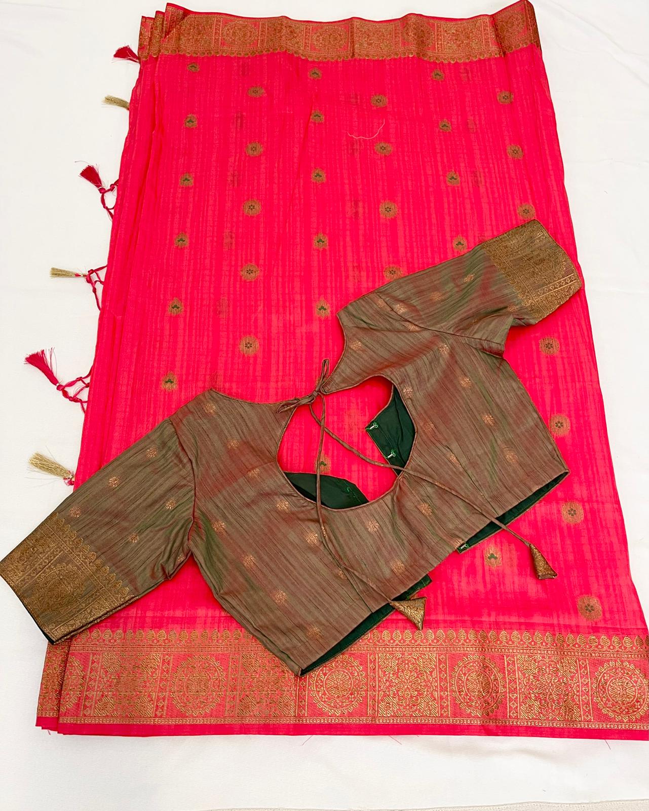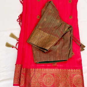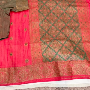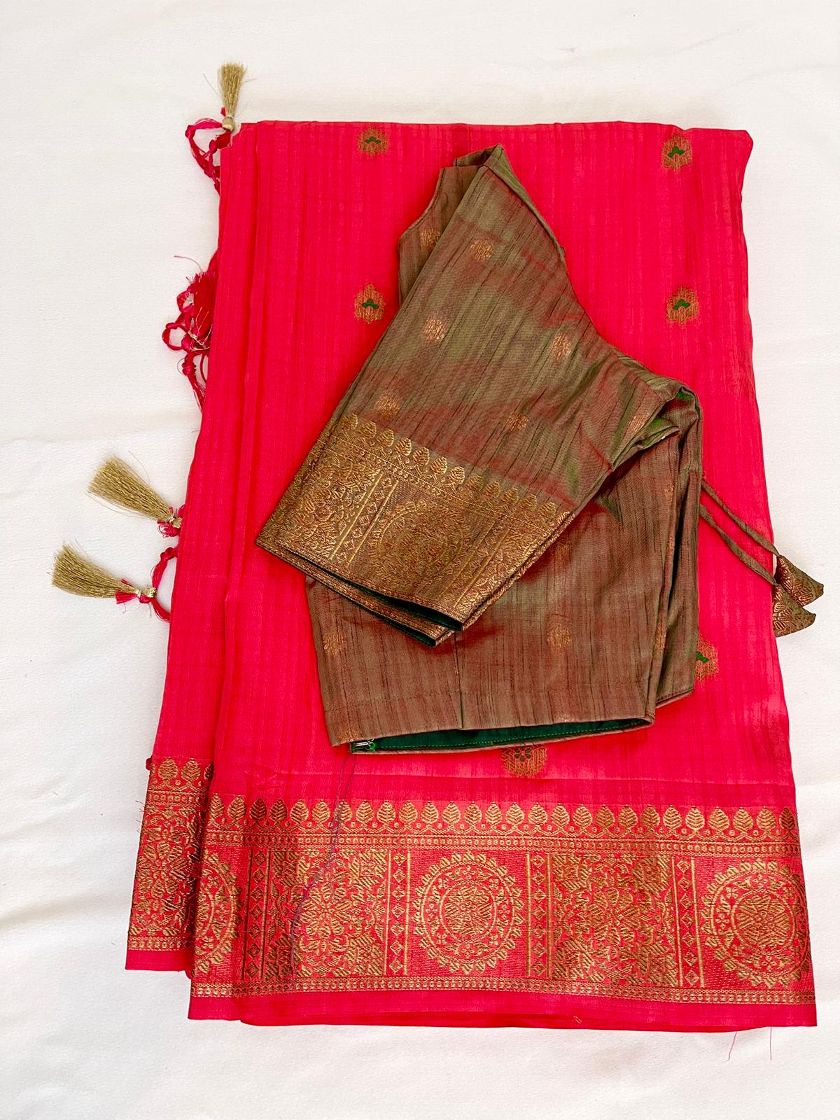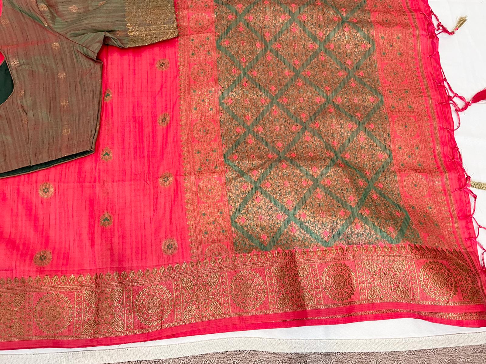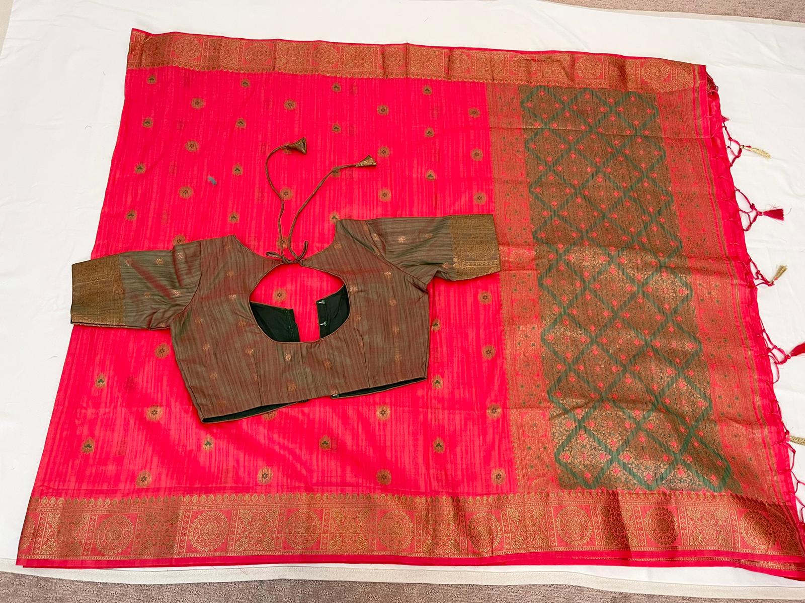 Soft Banarasi saree with all over butis with contrast stitched blouse and pico (fall)